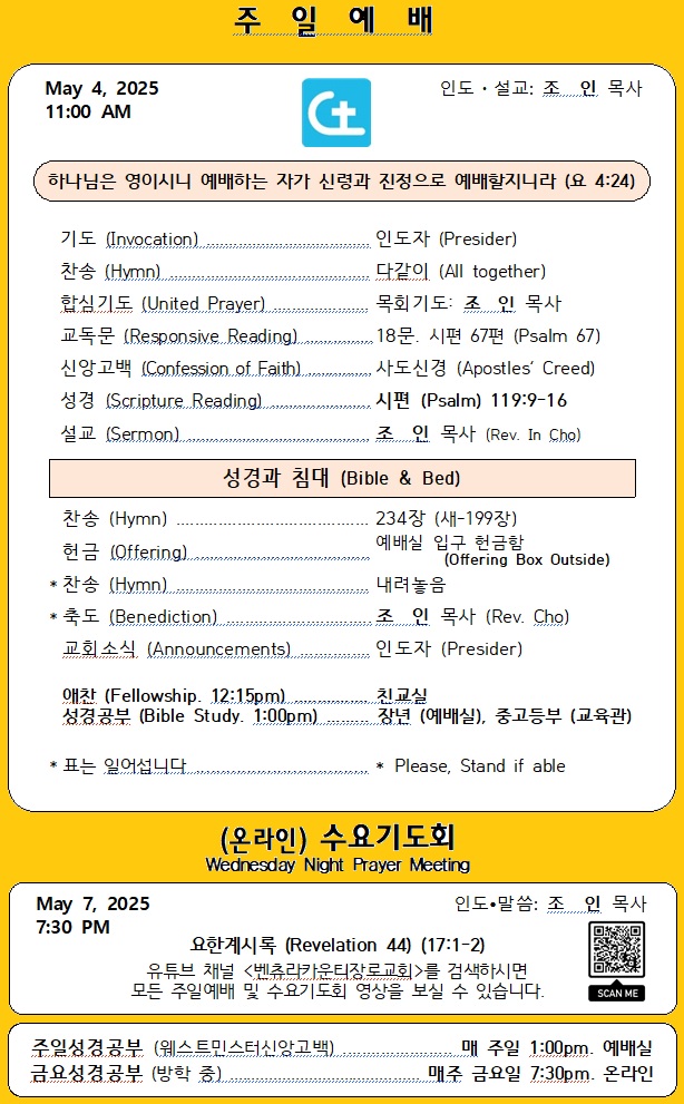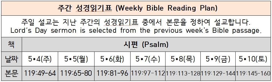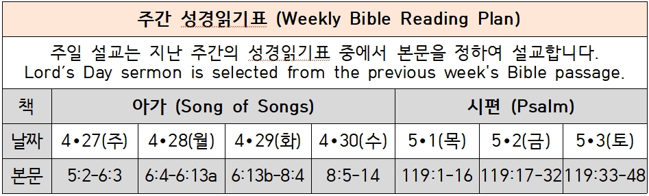 매주일 설교는 지난 주간 성경읽기표의 본문 중에서 정하여 설교합니다. 매일 성경읽기표를 따라 성경을 읽고, 묵상하고, 말씀에 순종하고, 매주 한 구절씩 암송하는 교우들이 되시길 바랍니다. Every Sunday sermon is selected from the previous week's Bible reading plan. Please follow the Bible reading plan everyday by reading, meditating, obeying the Word of God, and memorizing one verse every week.