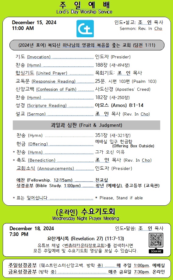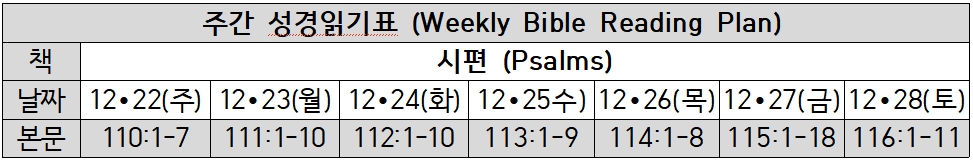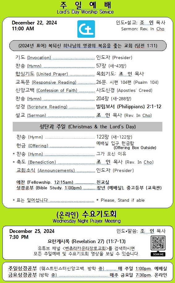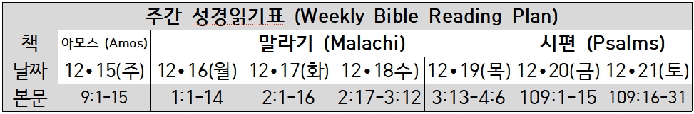 매주일 설교는 지난 주간 성경읽기표의 본문 중에서 정하여 설교합니다. 매일 성경읽기표를 따라 성경을 읽고, 묵상하고, 말씀에 순종하는 교우들이 되시길 바랍니다. Every Sunday sermon is selected from the previous week's Bible reading plan. Please follow the Bible reading plan everyday by reading, meditating, and obeying the Word of God.