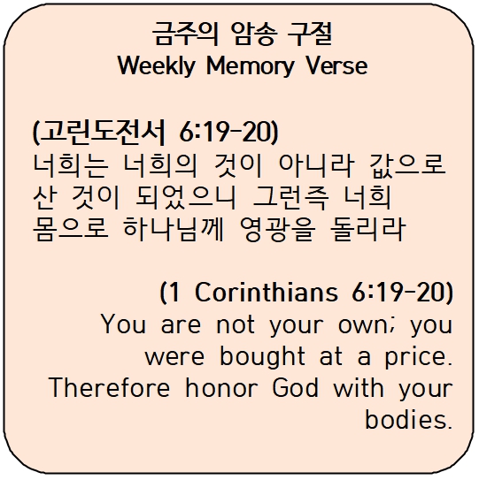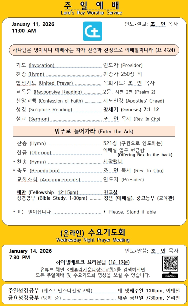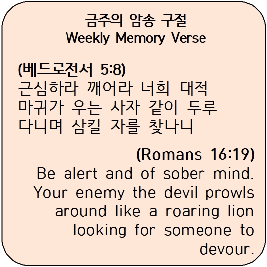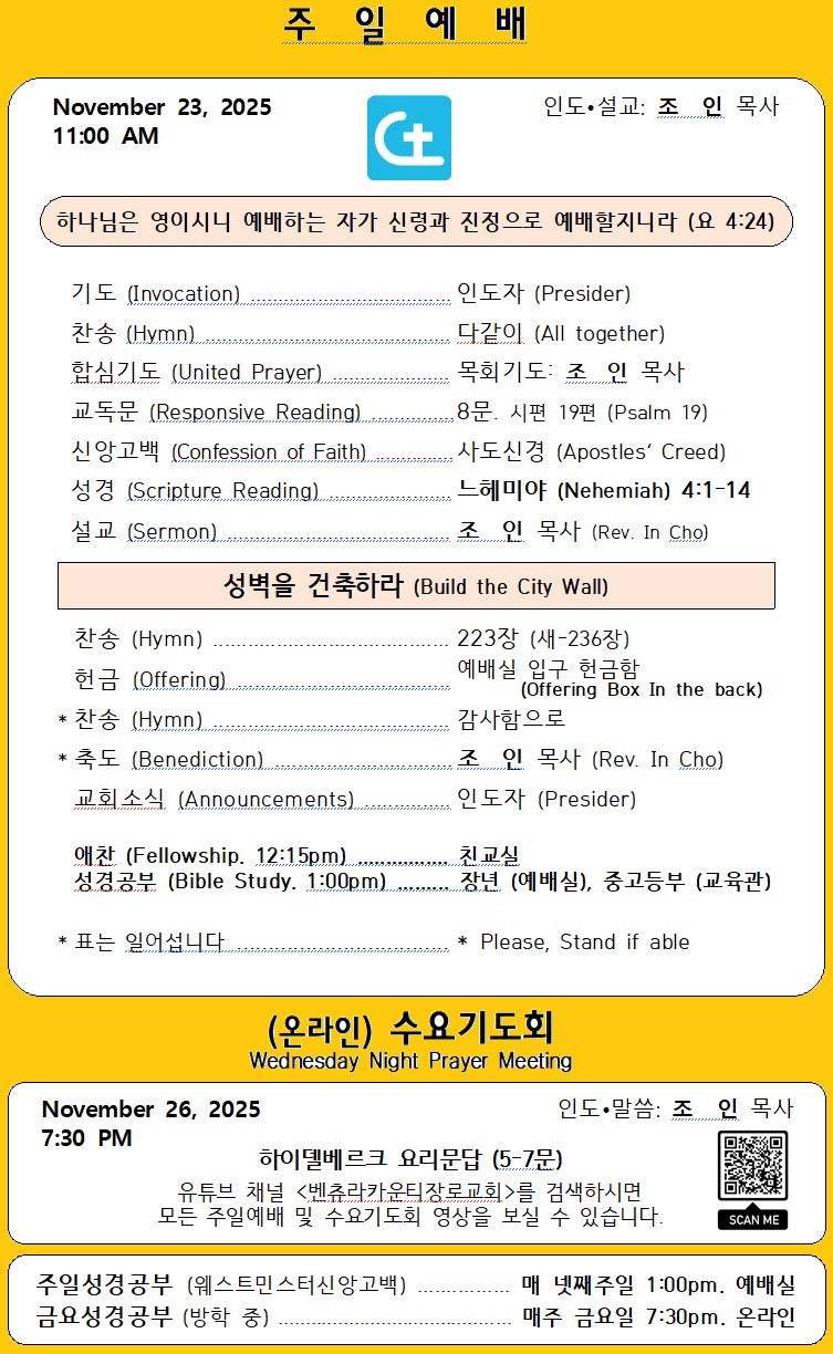 매주일 설교는 지난 주간 성경읽기표의 본문 중에서 정하여 설교합니다. 매일 성경읽기표를 따라 성경을 읽고, 묵상하고, 말씀에 순종하고, 매주 한 구절씩 암송하는 교우들이 되시길 바랍니다. Every Lord's Day sermon is selected from the previous week's Bible reading plan. Please follow the Bible reading plan everyday by reading, meditating, obeying the Word of God, and memorizing one verse every week.