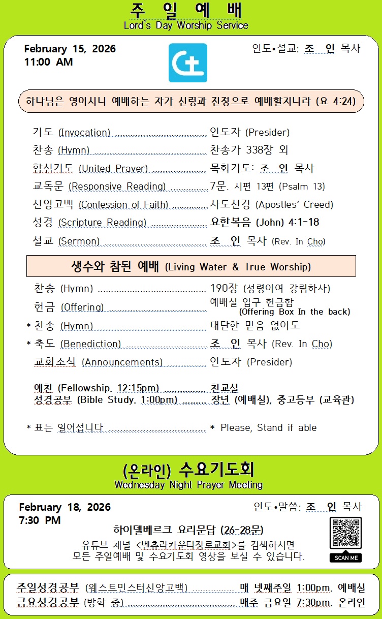 매주일 설교는 지난 주간 성경읽기표의 본문 중에서 정하여 설교합니다. 매일 성경읽기표를 따라 성경을 읽고, 묵상하고, 말씀에 순종하고, 매주 한 구절씩 암송하는 교우들이 되시길 바랍니다. Every Lord's Day sermon is selected from the previous week's Bible reading plan. Please follow the Bible reading plan everyday by reading, meditating, obeying the Word of God, and memorizing one verse every week. 성서유니온 홈페이지 ( www.su.or.kr ) 에서 오디오 해설(한국어)을 듣고, 문자 해설(영어)을 보실 수 있습니다. You can li..
